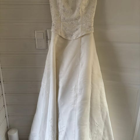 Lang hvit brudekjole med smale stropper og broderte detaljer på overdelen og nedover skjørtet. Kjolen har glatt, fotsidt skjørt med slep og dekorative blomster- og mønsterbroderier foran og bak. Passer til kvinne/dame til bryllup eller andre formelle anledninger der brudekjole ønskes.