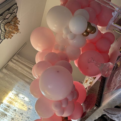 Fin girlander med «Happy Birthday» og ballonger i hver ende. Ballongene er røde, hvite og blå. Har hengt framme en uke. Synd å kaste, og kan fint brukes igjen for noen som trenger det mer enn oss.