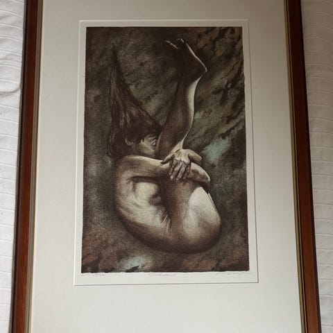 Signert grafisk trykk av Jøran Flo med aktmotiv, Psyke II , nummerert 43/140. Trykket er innrammet med passepartout og glass. Mål på selve litografi: 43x57cm.
