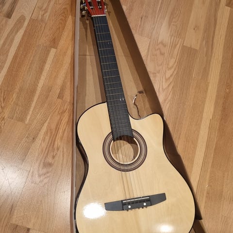 Admiral klassisk akustisk gitar med nylonstrenger i naturfarge. Gitaren har klassisk kropp med naturfarget lokk og mørkere gripebrett og stol. Den er utstyrt med nylonstrenger som gir en mykere spillfølelse og en rund, varm klang. Egnet som standard klassisk gitar for øving og generelt bruk. Den er prøvd 1 gang.