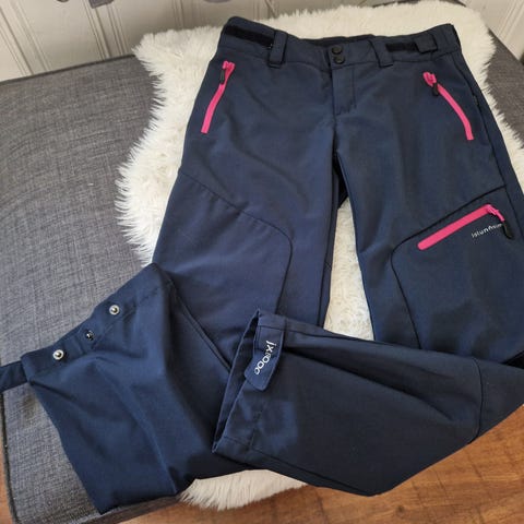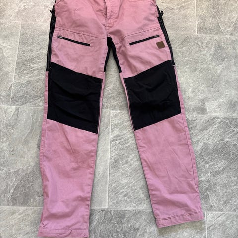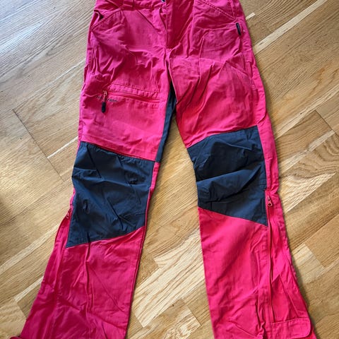 Jotunheim Fossberg bukse i størrelse 158. Bukse i rosa farge, laget hovedsakelig av polyesterblanding. Modellen har flere lommer med glidelås og beltehemper i livet. Stoffet består av ulike ytterstoffer med innslag av bomull og elastan for økt komfort og bevegelighet. Buksen har vært brukt av en jente, ca 11 - 13 år gammel. Vil si buksen er liten i størrelse til og være en damebukse som merkelappen i buksen sier.