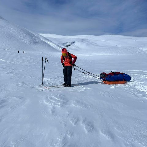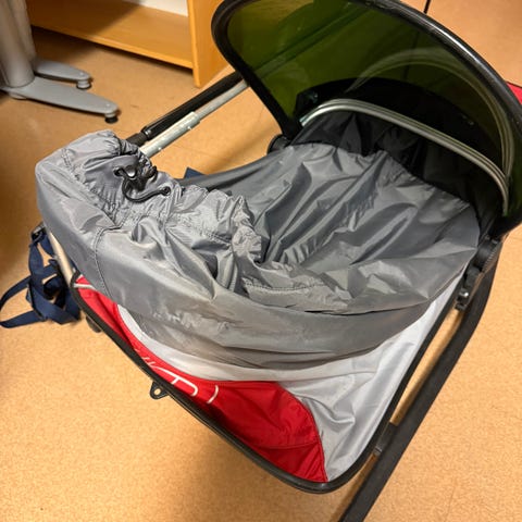 Barnepulk for bruk på ski, med drag festet til sele eller hoftebelte. Pulken har overbygg og plass til barn, og er egnet for turer på preparerte skiløyper og i lett terreng. Utformingen gir god glid på snø og stabilitet under trekking. Passer for vinterbruk der man ønsker å ta med barn på ski- og fjellturer.
