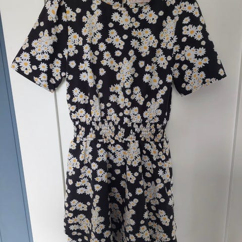 Kjolen er en ettersittende modell med noe puff ermer. Knepping bak i nakken. Kjolen er fra Lindex. Den er lite brukt og i godt stand.