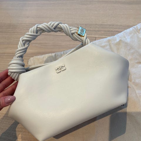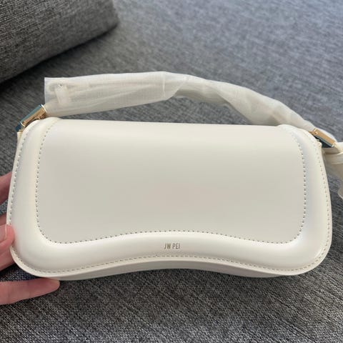 Zara clutchveske i kunstlær for dame. Vesken er i lys/hvit tone med et markert, buet håndtak i gullfarget metall på fremsiden. Innvendig har den et hovedrom med lys tekstilfôr og en liten lenke/rem festet i siden. Størrelsen passer til mindre nødvendigheter som mobil, nøkler og små personlige eiendeler. Egnet som håndholdt veske til anledninger der man ønsker en kompakt og strukturert veske.