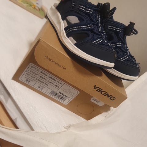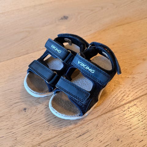 Viking thrill sandaler for barn, unisex, i størrelse 22. Åpen modell med pustende mesh og syntetisk materiale i grønnfarge med blå detaljer. Sandalene har justerbar borrelåsrem og elastisk stramming foran for bedre passform. Sålen er lett og fleksibel, egnet til bruk i hverdagen og til utendørs lek i sommerhalvåret.