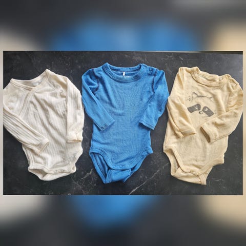 Pakke med to stk bodyer fra Joha i størrelse 70 (tilsvarer 68/74). Begge bodyene har bruksmerker i form av flekker og skraper/småhull, illustrert på bildene. Selges som de er, kan fint brukes som ikke-så-farlig-tøy.