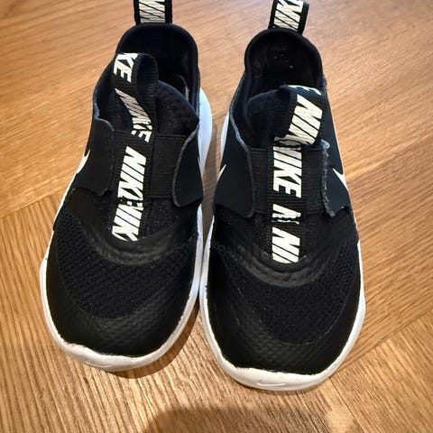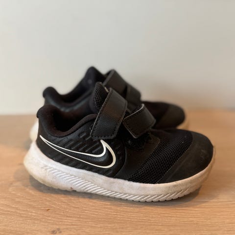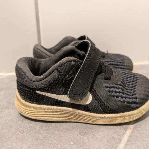 Nike joggesko for barn i størrelse 22. Modellen er unisex og kommer i grå farge med svarte Nike-detaljer. Skoene har to borrelåsstropper over vristen for enkel av- og påkledning. Overdelen er i tekstil og syntetisk materiale med polstret pløse og hælkant for komfort. Yttersålen er i gummi med mønster for grep. Passer til hverdagsbruk og lek for små barn.