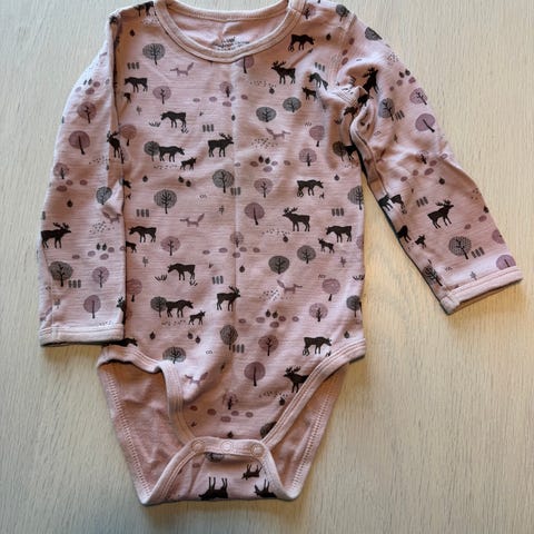 Body i blanding av ull og bambusviskose i størrelse 68. Litt fargeslitasje på linning, ellers hel og fin uten flekker eller hull. Fra Hust and claire.