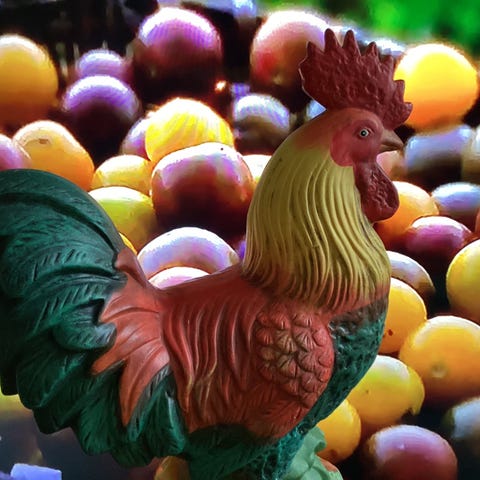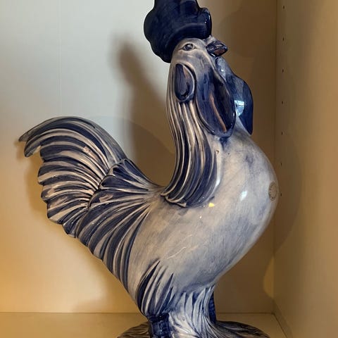 Dekorativ hane figur i flerfarget utførelse. Figuren forestiller en stående hane på sokkel, med detaljerte fjær og naturtro form. Egnet som innendørs pyntegjenstand på hylle, bord eller i vinduskarm. Størrelsen fremgår av bildet i forhold til fyrstikkeske ved siden av figuren. 40 cm høy.