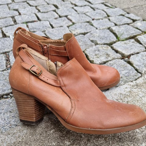 Mørk brun. God kvalitet, skinn både utenpå og inni. Tror også det er lærsåle med gummi. Kan ikke huske/se hvilket merke det er. En runde med lærbalsam vil gjøre godt! Jeg har brukt dem et par ganger til bunad, så det er en mulighet!