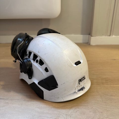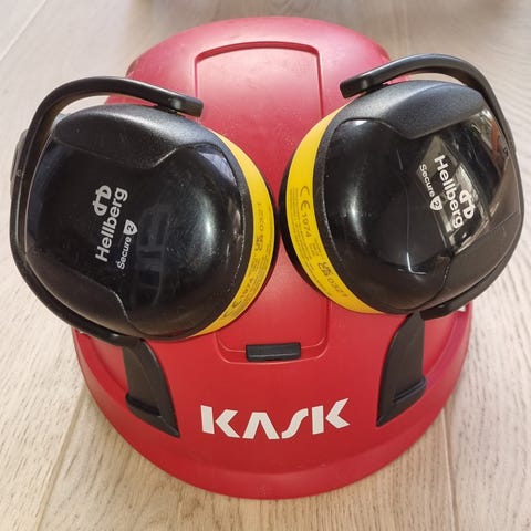 Stihl vernehjelm med visir og hørselvern samt vernestøvler oransje