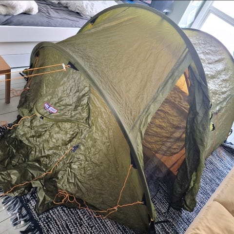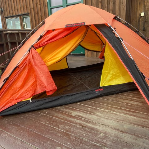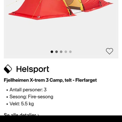 Pent brukt telt, som «nytt», kun brukt på noen vinterturer pr vinter siste 4 årene. Oppbevart tørt inne, og alltid tørket og luftet godt etter bruk. Ingen synlig slitasje, men strikken i teltstengene må byttes.(kjent helsport «problem» at disse blir «tørre». To ledd på to stenger byttet (orginale helsport).