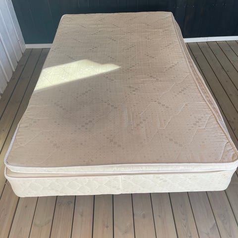 Rammeseng 120 cm med bonell fjærsystem fra Madrasseksperten (Madrass-Fabrikken) selges. Rammen rundt er polstret, 22 cm høy. Hvite (litt gulnet) bein følger med. Sengen er brukt noen år av tenåring, men har siste åra stått som gjesteseng. 5 cm overmadrass i kaldskumkvalitet følger med. Madrassen har avtakbart trekk som kan vaskes (dette er ikke blitt gjort, bør gjøres av kjøper ☺️). Sengen er fin som ekstraseng/gjesteseng.