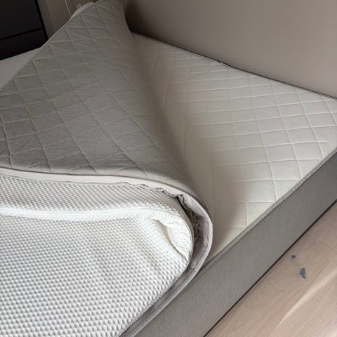 Pent brukt rammemadrass med bein, 120 cm x 200 cm, selges. Det følger også med 5 cm tykk overmadrass til sengen.