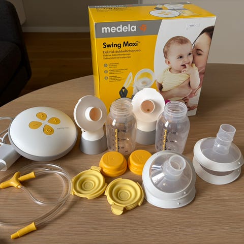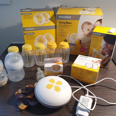 - Flere Medela brysttrakter i ulike størrelser (to i str 24mm, seks stk i str 27mm, én i str 30mm)