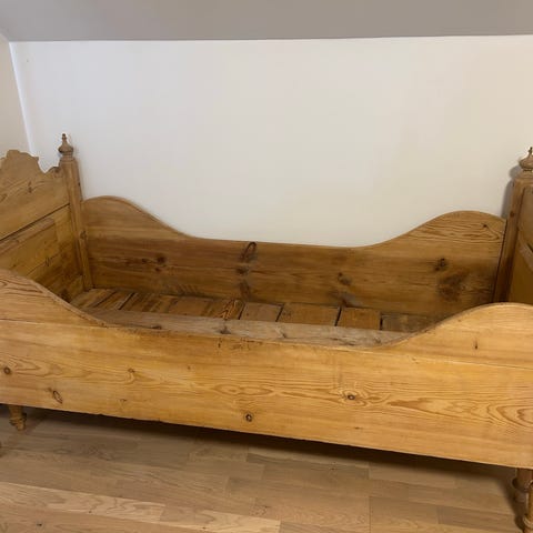 Koselig gammel skuvseng med utskjæringer selges. Den kan justeres i bredden, og madrass kan følge med hvis ønskelig.