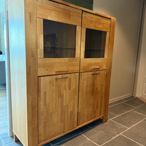 Selger en pen, hvit skjenk. Møbelet har fire skuffer med speil, og én skapdør med klart glass. Skjenken gir god oppbevaringsplass, samtidig som det har et rent og stilfullt uttrykk. Pent brukt, med normale bruksspor.