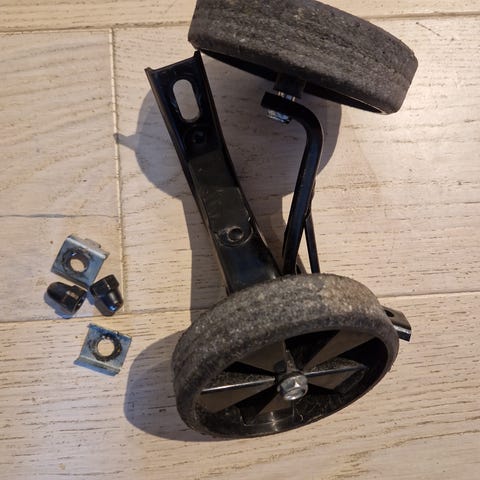 Pent brukt støttehjul gis bort mot henting. Man må sørge å finne skruene for å feste de til sykkelen.