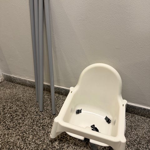 IKEA høy barnestol i hvit plast. Består av sete med ryggstøtte og avtagbare ben. Stolen har enkel sele/fastspenningssystem for barnet. Egnet som spise- og sitteplass for små barn ved bord. Lett å rengjøre og flytte på, og kan demonteres for oppbevaring eller transport.
