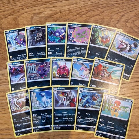 Kortene er standard Pokémon TCG-spillkort i vanlig størrelse. De kan brukes både til samling og til spill i Pokémon Trading Card Game. Detaljer om utgaver, språk, årstall og eventuelle spesialsett fremgår av bildene på annonsen.