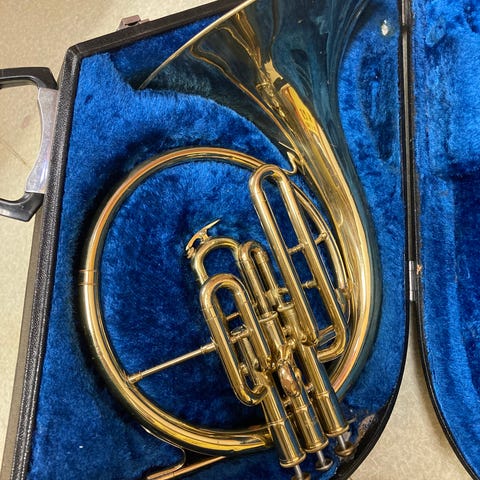 Valthorn i messing med roterende ventiler. Instrumentet leveres med munnstykke og hard koffert med polstret innside. På bildene følger det også med ventilolje og tilbehør som notelyre/festebøyle. Egner seg til bruk i korps, orkester eller som øvingsinstrument for elever og viderekomne musikanter