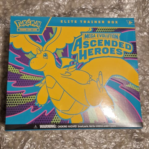 Selger en Pokémon Elite Trainer Box (ETB) fra settet Mega Evolution: Ascended Heroes.