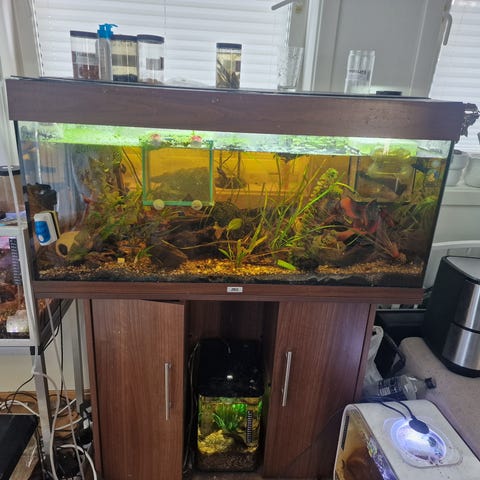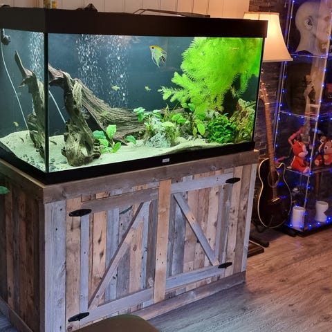 Jebro 333 liter. Det følger med ny pumpe gir 700 liter. Ny pris 2000kr Akvariet har rektangulær form med glasskar og topp med integrert belysning. Skapet under har dører med oppbevaringsplass til utstyr som filter, slanger og tilbehør. Passer til innendørs bruk for hold av akvariefisk og vannplanter. Det følger med diverse teknisk utstyr og tilbehør slik som filter og fôr, slik det fremgår av bildene. Følger med fisk og planter. Må hentes.