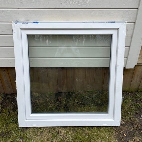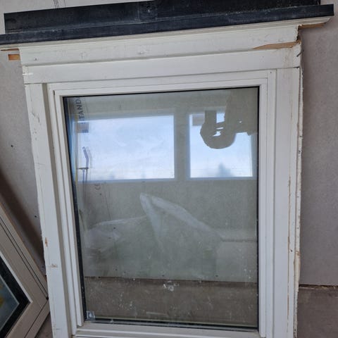 Hvitt vindu med karm. Vinduet har hvit ramme og glassfelt, egnet for montering i yttervegg eller lignende konstruksjoner. Passer til bruk der man trenger et vindu med lysinnslipp og standard karmløsning. Nøyaktige mål, åpne-/lukkefunksjon og type glass bør kontrolleres ved interesse. 120x130 dimensjon