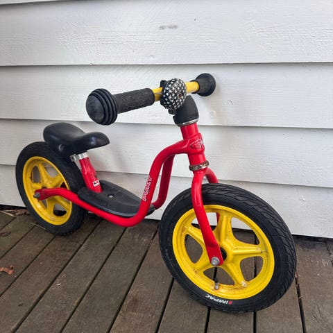 Puky løpesykkel med 10" hjul i rød farge. Sykkelen har lav innstigning, polstret styre med håndtak, og justerbart sete. Egnet som balansesykkel for mindre barn som skal øve på balanse og koordinasjon før overgang til vanlig barnesykkel.