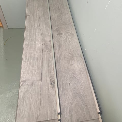 BeryAlloc laminatbord trestruktur i eik. Egner seg meget godt som slitesterkt gulv. Demontert fra utleiedel i eget hus, ca. 25 kvm. Bredde bord 190 mm., lengde 1200 mm. Ser nærmest ubrukt ut.
