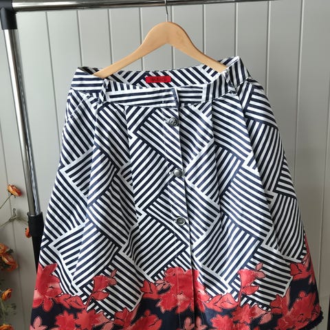 Bomullsskjørt i rødt, hvitt og blått fra b.young. Hvit bakgrunnsfarge med røde prikker, og stripemønster i rødt, hvitt og marineblått nederst. A-fasong med legg som gir god vidde i skjørtet. Glidelås og knapp i siden. Ekstra knapp følger med. 100 % bomull.
