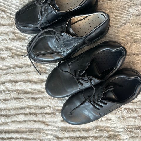 Sorte pensko for gutt i størrelse 38 gis bort. De to til venstre er Zara, paret til høyre ukjent. Zara skoene står størrelse 38, det siste paret er sannsynligvis også 38, men står ikke i skoene.