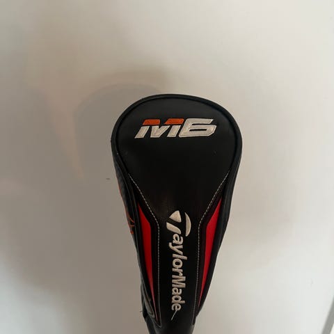 TaylorMade M6 golfkølle hybrid. Køllen har et kompakt køllehode med sølvfarget slagflate og svart topp med røde og sølvfargede detaljer. Skaftet er svart. Det følger med originalt M6 headcover i svart med røde detaljer. Egnet som hybridkølle på banen for ulike typer slag fra fairway og rough.