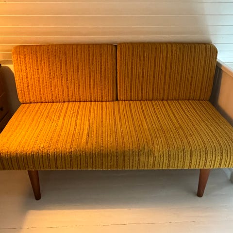 Selger en flott og karakterfull sovesofa med tydelig retropreg. Dette er et møbel med både sjel og funksjon – perfekt for deg som liker vintage, eller trenger en praktisk løsning til gjester.
