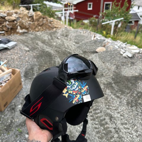 Noen bruksmerker på brillene og hjelmen.