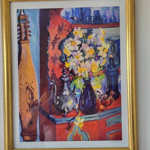 Bildet er i en klassisk gullramme som gir et litt tradisjonelt og elegant preg. Passer godt i både moderne og mer rustikke hjem.