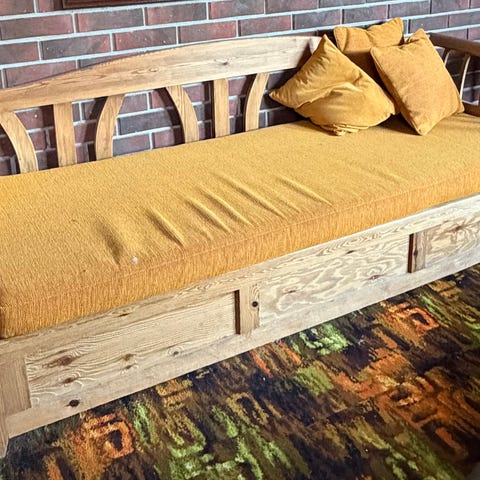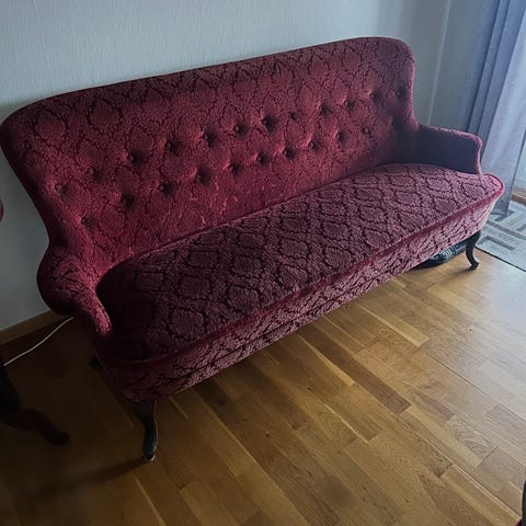 Gammel puff selges. Har blitt trukket om for mange år siden. Hengslene på lokket er ikke festet.