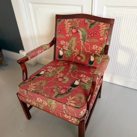 P.S Har flere stoler av samme type, hvis man ønsker å bestemme stoff selv. Da kommer eventuelle utgifter til stoff i tillegg..