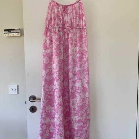 Ganni sommerkjole for dame i størrelse S. Kjolen er rosa med mønstret trykk og laget i silke. Modellen har firkantet utringning, trekvart ermer med lett utsving og rynkedetaljer i livet. Skjørtet er kort med volangkant nederst. Passer til sommerbruk og andre anledninger der en lett og tynn kjole er ønsket.
