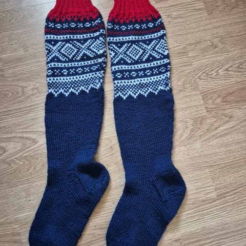 Strikkede ullsokker med norsk mønster. Strikket i Viking sportsragg. Størrelse ca. 38.