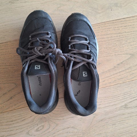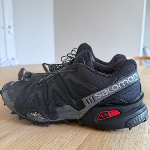 Salomon terrengsko, brukt til løping, størrelse 37 1/3. Skoene har hurtigsnøring og kraftig mønstret såle som gir godt grep på underlaget. Lite brukt. Lette sko. Ikke vasket i vaskemaskin, men tørket av. Fremdeles litt møkkete, se bilder. Masse bruk igjen!