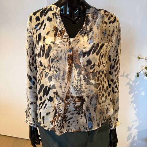 Brunmønstret skjørt i str 40 fra Katrin Uri. Det er et underskjørt i myk trikot og selve skjørtet er i 100% silke i ulike lengder. Det er to lag med silke. Skjørtet er i meget god stand og måler 84 cm i livet og Skjørtets lengde er 64 cm. Skjørtet selges for kr 300,-