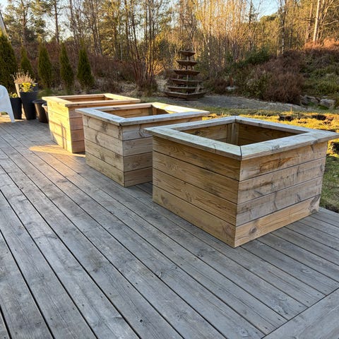 Sekskantet blomsterkasse i treverk i brun farge. Kassen står på ben og er egnet for planting av blomster og mindre planter på terrasse, balkong eller i hage. Åpen topp gjør det enkelt å fylle med jord og plante etter behov. Var ny sommeren 2025. Høyde 43 cm. Bredde 67 cm.