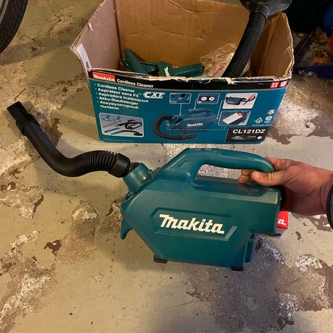 Integrert oppsamler. Grei å ha for bilen eller andre steder som er trangt og vanskelig å komme til. Selges uten lader. Funker som den skal