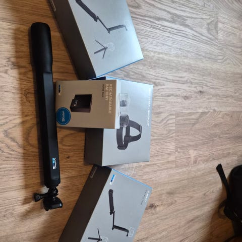 GoPro actionkamera med tilbehør og etui. Pakken inneholder actionkamera, håndgrep, hodefeste, monteringsfester, to batterier, USB-kabel og etui. Egnet for opptak av video og bilder i ulike aktiviteter som sport, reise og friluftsliv. Kameraet kan monteres på kropp eller utstyr ved hjelp av de medfølgende festene, og oppbevares samlet i etuiet når det ikke er i bruk.