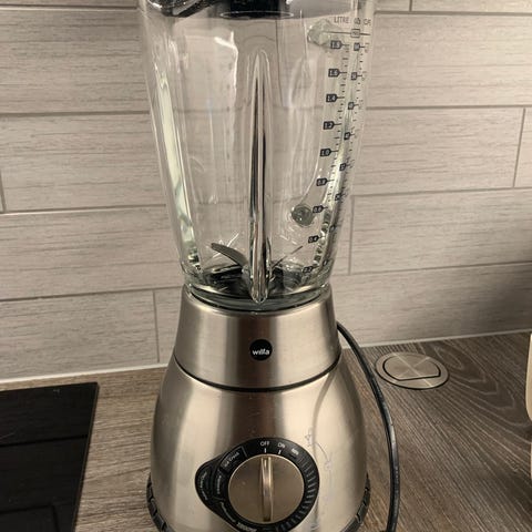 Kraftig Wilfa blender med base i rustfritt stål og glasskanne. Blenderen har lokk med påfyllingsåpning og tydelig måleskala på kannen.