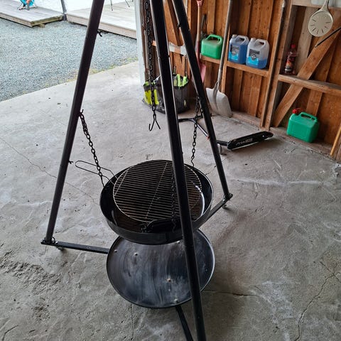 Trefot bålpanne i svart metall med rund ildskål og avtagbar grillrist i metall. Bålpannen henger i kjettinger fra et stativ med tre ben, og høyden på grillristen kan justeres ved hjelp av krokene på kjettingene. Egnet til bruk som bålpanne og grill på terrasse, i hage eller på turplass der det er tilrettelagt for åpen ild. Nederst i ildskålen er det åpning for lufting og drenering. Kan leveres Hafjell eller Lørenskog, Drammen området.