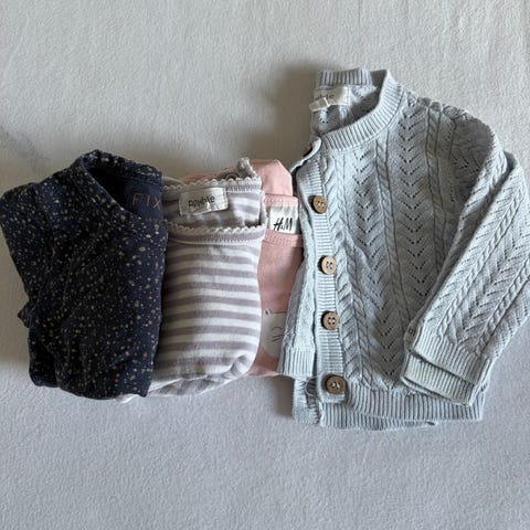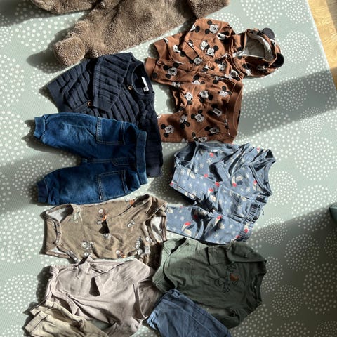 klespakke med 7 bukser i størrelse 62. Pakken inneholder 4 bukser fra H&M, 1 bukse fra Adidas, 1 bukse fra Reima og 1 bukse fra Cubus. 85kr