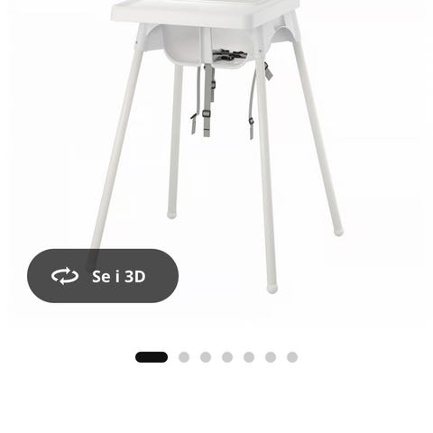 IKEA Antilop barnestol med brett i hvit plast med metallben. Stolen har integrert sikkerhetssele og avtagbart spisebrett. Egnet som høy stol til små barn ved spisebord eller annet bord. Lett konstruksjon som er enkel å rengjøre og flytte på.