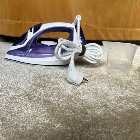 Philips dampstrykejern med tilhørende base i hvit og lilla. Strøykejernet har slange/ledning mellom base og jern, og såle med flere damphull for jevn dampfordeling. Basen har tilkobling til strøm og fungerer som holder og oppvarmingsstasjon for jernet. Passer til stryking av ulike tekstiler i hjemmet, både skjorter, bukser og annet tøy som krever jevn varme og damp.